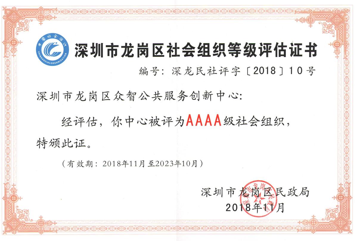 深圳市龙岗区众智公共服务创新中心成立于2015年8月19日,是龙岗区首家支持型社会组织,4A级社会组织。众智以创新为核心驱动力,面向社会公众、面向社会组织、面向政府企业提供专业支持,核心业务是:品牌打造、能力提升、智库支持、资源拓展、行业规范、项目研发、伙伴同行、机构孵化八大类服务。