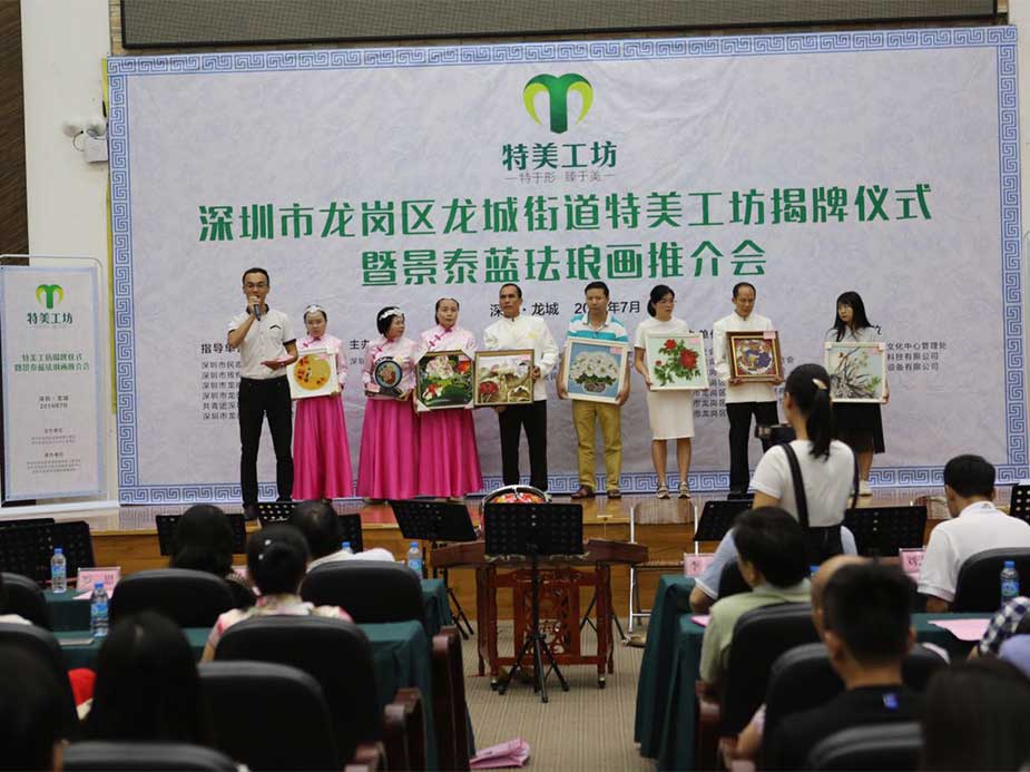 7月22日下午2:30,龙城街道“特美”工坊揭牌仪式暨景泰蓝珐琅画推介会在区文化中心成功举行。来自政府机关、企事业单位、商协会、爱心企业、爱心人士等100名左右代表参加了本次活动。此次活动由龙城街道办事处主办,龙城街道残疾人联合会、龙岗区众智公共服务创新中心共同承办,深圳市社会公益基金会等7家商协会联合协办,龙岗区文化中心管理处、深圳热播网络科技有限公司、深圳三景净水设备有限公司对本次活动给予了大力支持。活动共分为两个部分,第一部分举行了“特美”工作坊揭牌仪式、景泰蓝珐琅画展示、“梦飞龙城”民乐团表演;第二部分举行了景泰蓝珐琅画体验交流和爱心认领。本次活动得到了市民政局、市残联、区社工委、区民政局、团区委、区残联的指导,龙城街道党工委副书记梁珂代表龙城街道致欢迎词,并同参会领导一同为“特美”工坊揭牌。