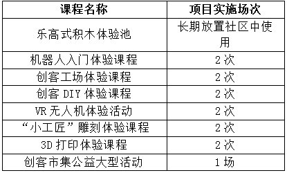 时间及周期:“创客进千家,科技零距离”项目实施时间为半年,包含1场大型活动及12场课程活动,共13场活动。(具体实施时间可根据社区实际情况进行调整)